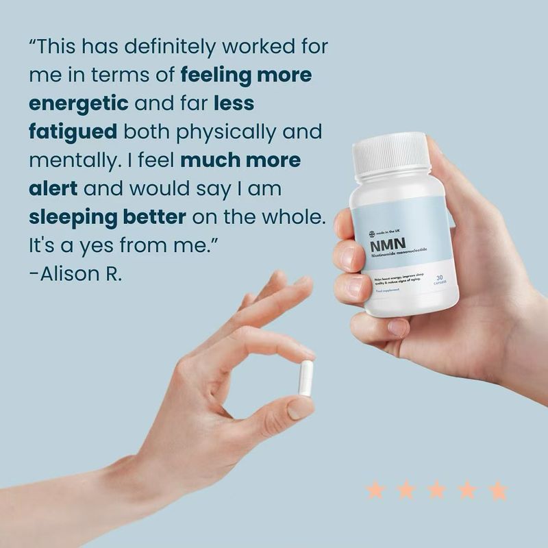 Premium NMN dietary supplement for an energy boost and improved sleep! Each bottle contains 30 capsules, scientifically formulated to promote cellular health and help you cope with the stresses of modern life. Made in the UK for reliable quality. Perfect for those who pursue a naturally healthy lifestyle!